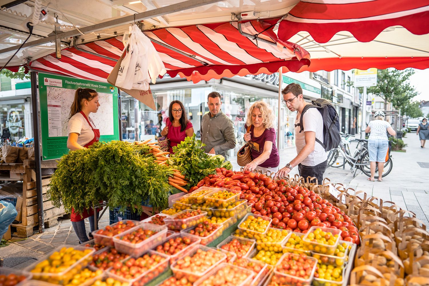 We start at Düren railroad station and head north along Josef-Schregel-Straße, Alte Jülicher Straße and Veldener Straße. Behind the Boss furniture store, we cross Veldener Straße at a crossing aid and follow the signs to Dürener Badesee. Once there, we turn left onto an agricultural path and cycle around the lake until we reach Derichsweiler. Where we leave the lake circuit, we have to be careful. First the path splits and we keep left, cycle down over the wooden bridge and shortly afterwards the path climbs up to the B 264. We recommend dismounting here if necessary and pushing the bike up the few meters. We then cross the main road and cycle into Derichsweiler. We follow Dampfmühlenstraße and then turn onto Derichsweilerstraße (towards the cemetery). On this road we reach the district of Gürzenich. At the end of the path, we turn left and follow the Gürzenich stream for a short stretch. At the Sparkasse bank opposite, we cross the stream and the road and continue straight ahead into Ratsstraße. After just under 300 m, we turn left into Am Wingert and after a further 600 m turn right into Laverweg. Follow this until the end of the road in the Rölsdorf district. At the T-junction, we turn left, cross Monschauer Straße after a few meters and cycle parallel to Birgeler Bach along the street In der Mühlenau. We cross the B 399 and cycle straight ahead for a short distance on the footpath/cycle path against the one-way street (cycling permitted!). Before the school center, we turn right onto Cornetzhof. At the end of this road, turn right and then immediately left again. We cycle along the footpath/cycle path until we reach the path that runs directly alongside the Rur. We turn right here and cycle upstream to the next bridge over the Rur. We cross the bridge and then immediately turn right onto the RurUfer cycle path in the direction of Kreuzau/Lendersdorf. At the Schwanenbrücke bridge, we leave the Rur-Ufer-Radweg, turn left and follow the signs for the Wasserburgen-Route towards Burgau Castle. Cycle around Burgau Castle on the outer path, past the animal shelter, across the parking lot, cross the L 327 and continue straight ahead on the Wasserburge route. At the Mother of God wayside shrine, we turn left, pass a barrier at the edge of the forest and after about 500 m turn left onto the Stockheim historical hiking trail. At the bus stop, we cross the L 327 again and continue in a northerly direction towards Düren. At the end of the path, we turn left onto the somewhat bumpy Panzerstraße. At the next opportunity, we turn left (sign for nature reserve) and keep right behind the barrier. The path leads into a somewhat steep hollow path; it may be advisable to dismount and push the bike for a short distance. At the bottom, turn right onto a wide path through the Burgau forest and continue into Düren. Turn left at Dechant-Bohnekamp-Straße and right at the traffic lights. We leave the traffic circle at Europaplatz at the 2nd exit (Nippestraße) and turn right directly behind the Arena Kreis Düren. We first ride along the Mühlenteich and over a bridge to the left into the Holzbendenpark, which we cross along the outer edge to its end. At the end of the park, we cycle straight ahead on the footpath/cycle path until we reach the B 264 / Stürtzstraße. Keep right here and turn left at the next set of traffic lights into Oberstraße. This takes us into the city center of Düren, past the Annakirche church and directly onto the market square. We cross this diagonally (please dismount on market days) and cycle along Zehnthofstraße and past the StadtCenter towards Langemarckpark. Before the park, the road bends to the right and at the end of the road we turn left. We continue along Josef-Schregel-Straße for a short distance until we reach the starting point of our cycle tour at Düren station.